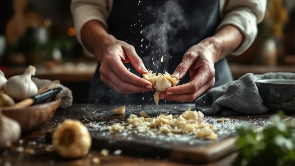 Manipolare aglio fresco per piatti deliziosi 🍽️